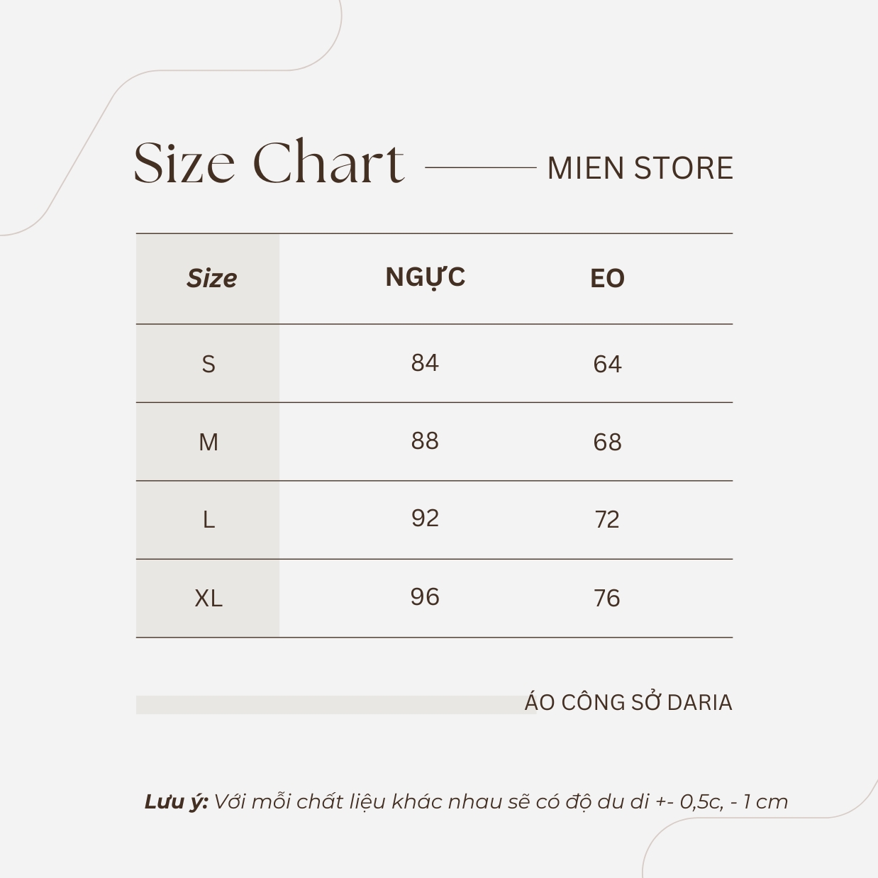Daria là form áo thiết kế hướng tới phong cách thanh lịch, sang trọng và chỉn chu với chất liệu vải Gân Hàn cao cấp có kết hợp ép mùng đứng form cùng một lớp lót mềm phía trong. Điểm nhấn của Daria nằm ở phần chiết eo đặc biệt giúp che khuyết điểm và định hình tỉ lệ theo form chuẩn hơn. Daria còn có đệm cầu vai để khắc phục khuyết điểm cho những cô nàng ngại vai thô, vai ngang.